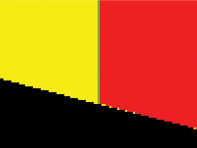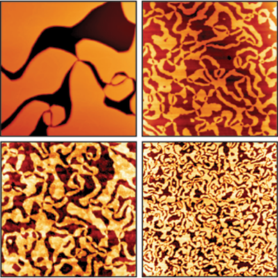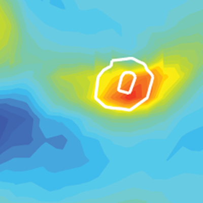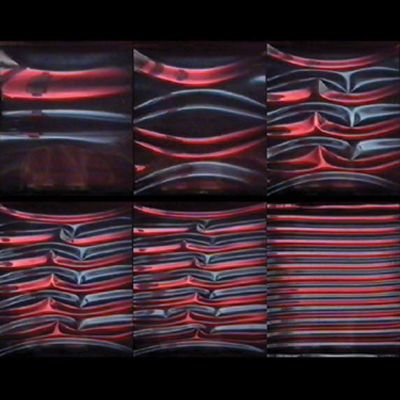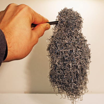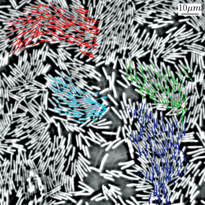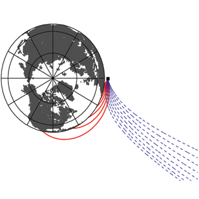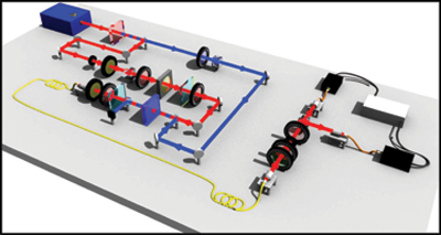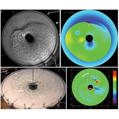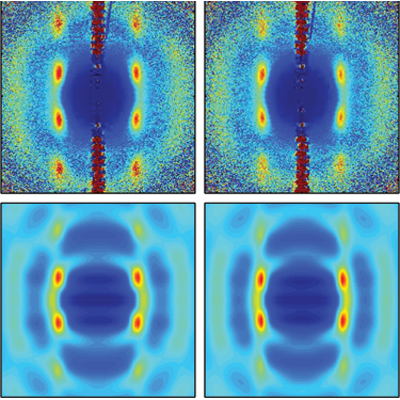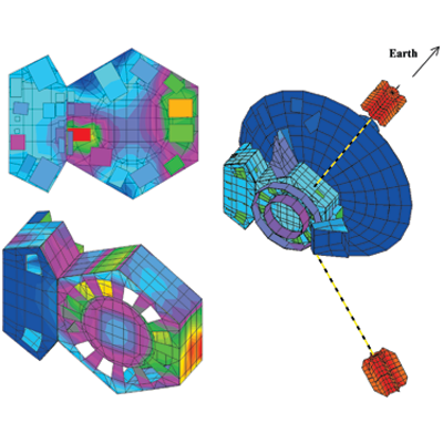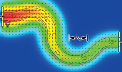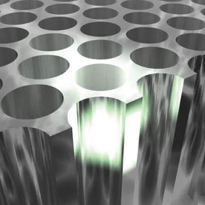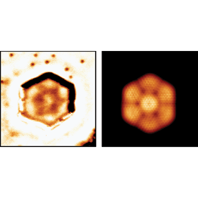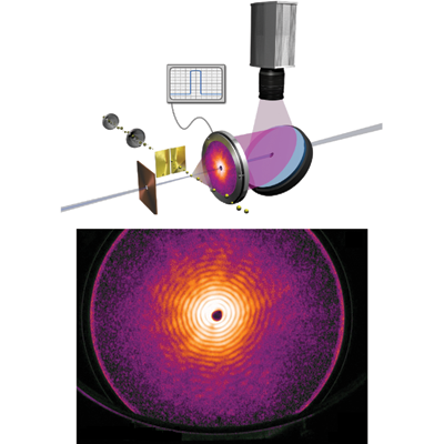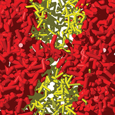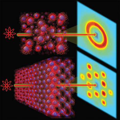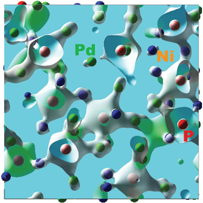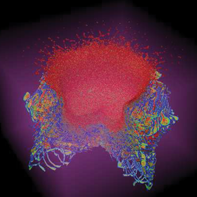 Model of the electronic wake (blue surfaces) generated by an energetic proton (red sphere) traveling in an aluminum crystal. The resulting change in electronic density is responsible for modification of chemical bonds between the atoms and consequently for a change in their interactions.