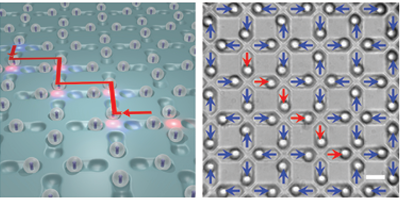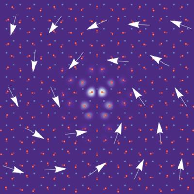 Sequence of scanning tunneling microscopy images of Au adatoms (circular protrusions) on NaCl(2ML)/Cu(111). Two initially neutral Au adatoms (marked by red arrows) were deliberately charged negatively and that initiated their diffusion.